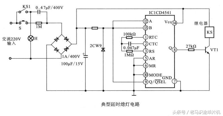 该电路中,接通按钮开关S瞬间,由于CD4541的Q,/QSEL端接高电平,使IC1德尔8脚输出高电平,VT晶体管饱和导通,继电器KS1吸合,照明供电电路处于自保持状态。经延时5分钟后,CD4541的8脚输出变为低电平,继电器KS1释放,照明灯断电熄灭。