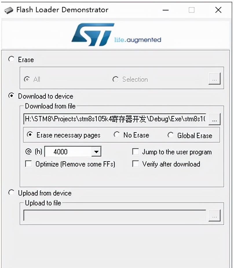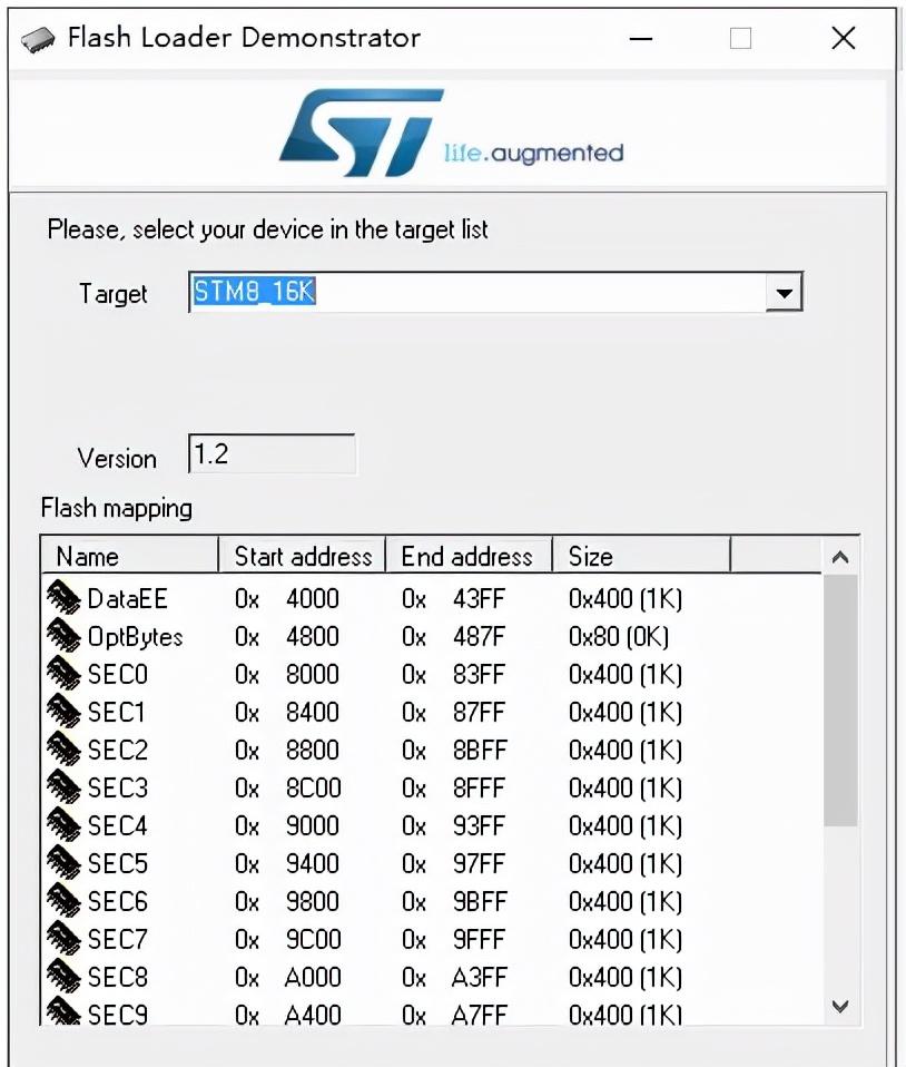 安装打开Flash Loader Demonstartor软件,使用USB转TTL连接好STM8单片机的串口,复位一下STM8单片机,这个下载软件和STM32的串口下载使用的是同一个。