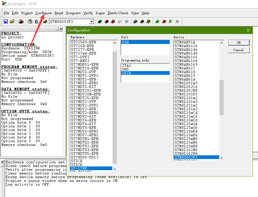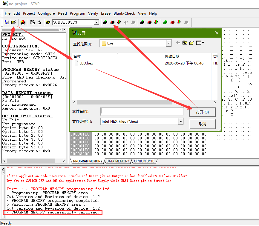 安装并打开STVP下载工具软件,配置好下载器和对应STM8开发板的芯片型号