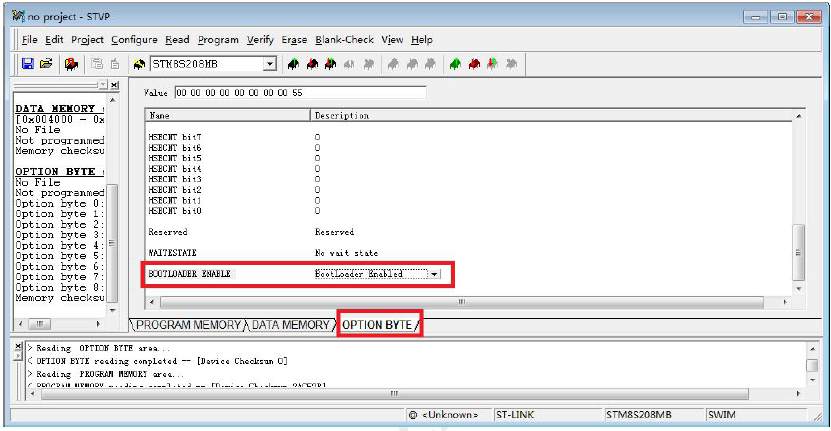 下载前用STVP工具软件读取芯片的选项字节,若发现没有使能BootLoader Enabled选项或者没有出现BOOTLOADER这一行,则该型号的芯片不支持串口下载。
