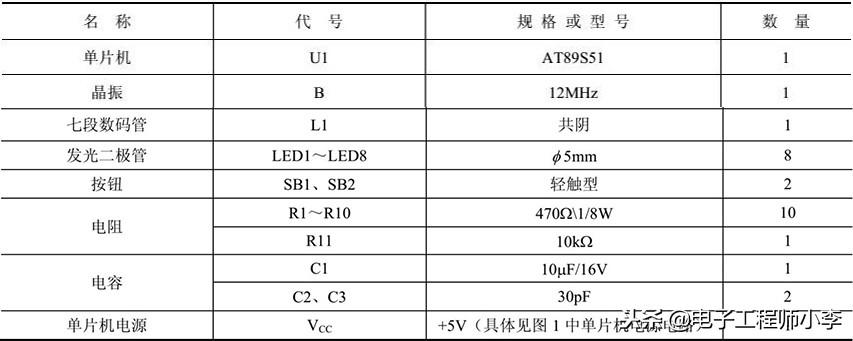 (2)彩灯键盘显示硬件电路元器件(见表19)。
