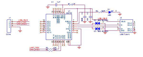 该串口采用简化设计,只用了TXD,RXD两根信号线。芯片外围电路简单,只在芯片复位管脚处增加了RC复位电路,在电源位置增加了电源指示灯。另一个需要注意的地方是,在USB接口靠近管脚位置上添加ESD保护器件,防止插拔USB接口的时候ESD造成芯片意外损坏。