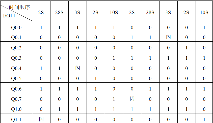 选一个循环周期(90S),以南北左转绿灯闪亮为开始,根据实验实际情况,记录其调试结果如表2,表中“1”表示其对应的I/O口在其对应的时间段输出为高电平,“0”则表示其对应的I/O口在其对应的时间段输出为低电平,“闪”表示闪亮。
