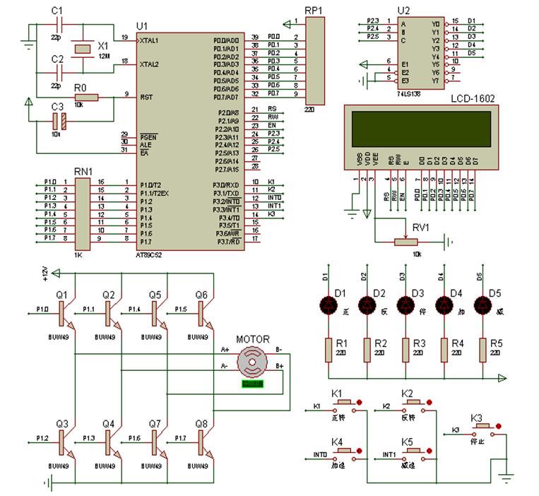LCD1602的数据/命令选择端、读写选择端、使能信号分别接在单片机的P2.0、P2.1、P2.2口上,数据口接在单片机的P0口上。LCD1602可以显示步进电机的5种运行状态以及运行速度。5位LED通过74LS138接在单片机的P2.3—P2.5口上,5位LD分别用于表示步进电机的正转、反转、加速、减速、停止5种运行状态。