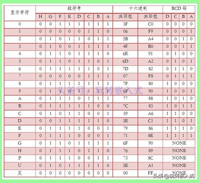 首先介绍数码管的程序编写 ,再编写程序时,都会预先定义好数码管的字段表,根据共阳数码管和共阴数码管的不同,其字段表也是不一样的,但是两者是互补的,数码管可显示的字段表如下图所示。