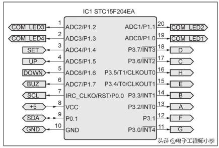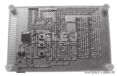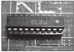 为了大家的制作方便,这个制作仍然使用STC的51控制器,ELEJ-CDC1使用的控制器型号为STC15F204EA,用DIP-20封装,电路连接如图1.1所示。STC15F204EA内部高精度R/C时钟,常温下温漂5‰,时钟从5~35MHz可选,这样我们就无需再外置晶体振荡器了。实际焊接在“洞洞板”上如图1.2所示。