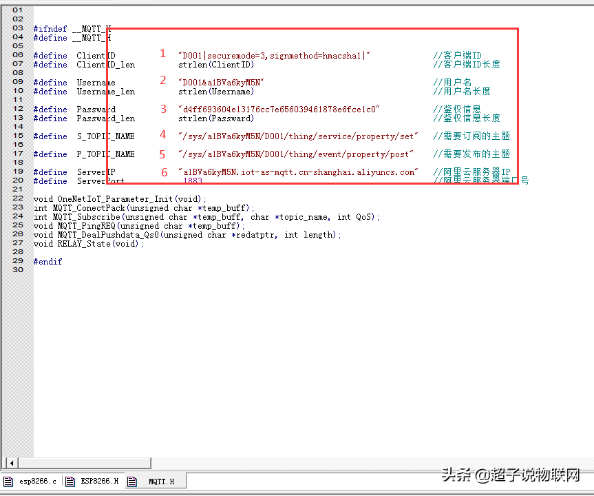 然后我们需要修改mqtt.h头文件中的6个字符串,最麻烦的就是第3个,也就是MQTT协议中CONNECT报文中的包含的密码信息。我们一个一个来,讲一下怎么修改。