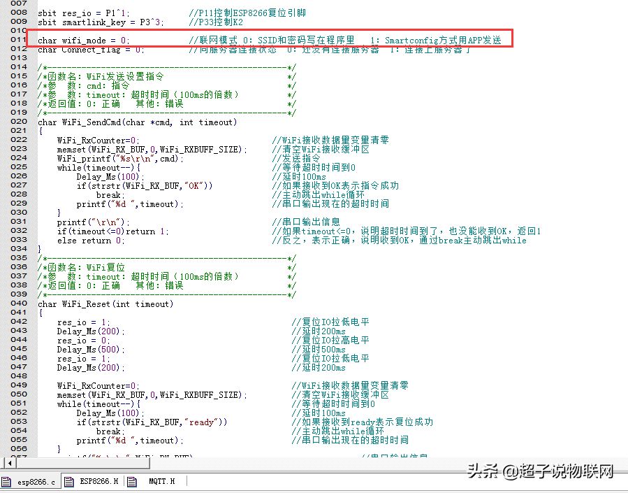 首先看esp8266.c源文件,wifi_mode变量用于设置使用哪种方式进行配网,大家根据注释自行选择就行,如果选择0的话,SSID和密码要在esp8266.h头文件中设置。