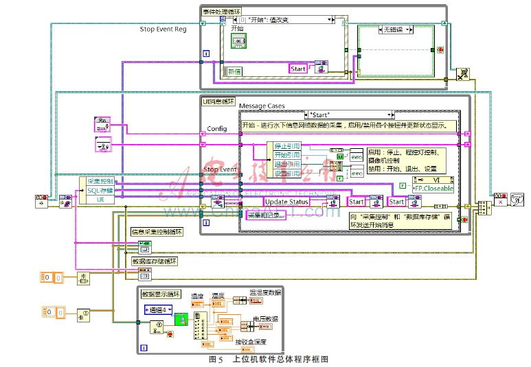 上位机软件设计中涉及到LabVIEW的多个功能和概念,主要包括枚举型、事件结构、通知器、状态机、生产者/消费者设计模式、While循环等。整个上位机软件充分利用了LabVIEW的并行处理优势,在以队列消息处理器为模板的基础上进行了设计和实现,队列消息处理器用于进行多个任务并行执行的设计,可以在进行数据连续采集和存储任务的同时监控用户界面事件。系统的程序框图如图5所示,可以看到系统由并行的5个循环组成,主要包括事件处理循环、UI消息循环、采集数据循环、存储数据循环、显示数据循环。事件处理循环(EHL)主要负责按用户界面操作生成对应的消息将事件生成消息传送到UI消息循环。UI消息循环从事件处理循环接收消息同时将响应消息送到其他消息处理循环(MHL)。采集数据循环主要进行远程接驳盒内部电能参数的采集。存储数据循环主要进行采集数据的记录。显示数据循环主要进行采集数据的处理和波形图表的更新。