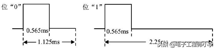 从上图中可以发现,位“0”、“1”均以0.565ms的高电平开始,不同的是低电平的宽度不同,“0”为0.56ms,“1”为1.685ms,所以可以根据低电平的宽度区别“0”和“1”。如果从0.565ms高电平过后,开始延时,0.56ms以后,若读到的电平为高,说明该位为“0”,反之则为“1”,为了可靠起见,延时必须比0.56ms长些,但又不能超过1.125ms,否则如果该位为“0”,读到的已是下一位的低电平,因此一般取(1.125ms+0.56ms)/2≈0.84ms。