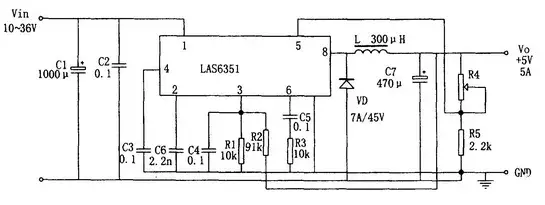如图所示为用LAS6351构成的大电流高效开关稳压电源。LAS6351是一种具有较完备功能的大电流可调脉冲宽度开关式集成稳压器。它能在承受 3~8A连续负载电流的情况下输出2.5~50V范围的电压;芯片内设有软启动、过载过压保护过热关闭保护电路;效率高达90%;由于开关频率高达 200kHz,因此降低了外部输出LC滤波器的成本。用它可直接组装15W、25W、40W可调式或固定式开关稳压电源。图所示电路是一个+5V、5A开关稳压电源。