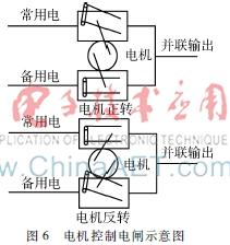 系统存在常用、备用两路电源,各由一个电闸控制。两个电闸间设计一个由电机控制的切换装置,电机正转时, 图6电机控制电闸示意图