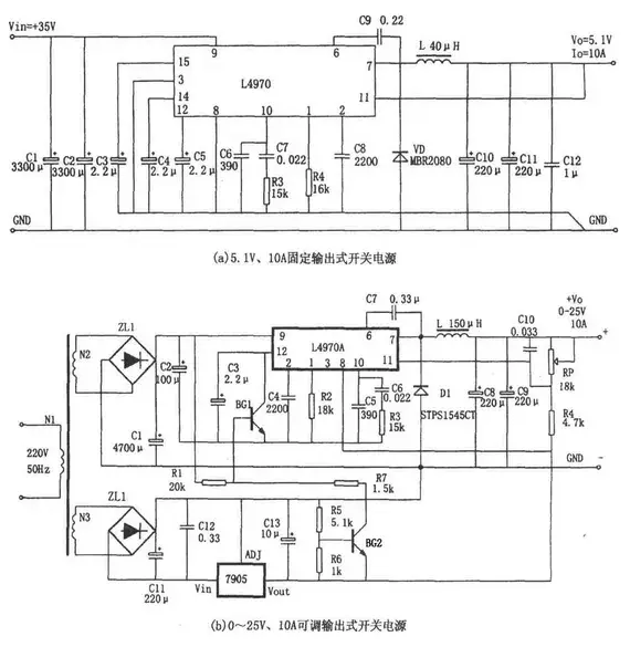 如图所示为由L4970A构成的大功率开关电源。L4970A是一种大功率单片开关集成稳压器,该芯片采用SIP-15封装,其特点是;(1)输入电压必须11V,一般为15~40V之间;(2)输出电压:固定输出5.1V,也可通过外部电路设置成可调输出,范围在5.1~40V;(3) 最大输出电流为10A;(4)工作频率200kHz;(5)内部设有欠压检测、掉电复位、功率级软启动等特殊电路。