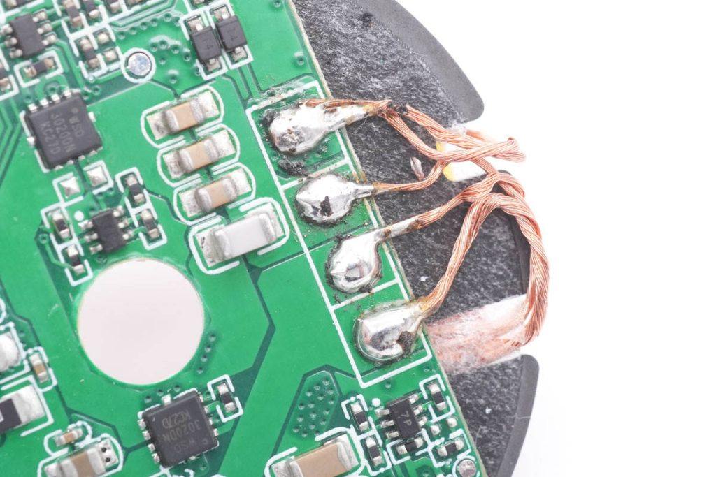 无线充电线圈焊接处特写,外侧较粗为手机无线充电线圈,内侧较细为手表无线充电线圈。