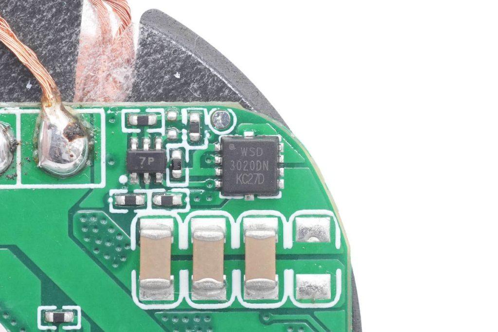 用于切换不同容量谐振电容的MOS管,来自微硕,型号WSD3020DN,是一颗耐压30V的双NMOS,导阻17mΩ,采用DFN3*3封装。