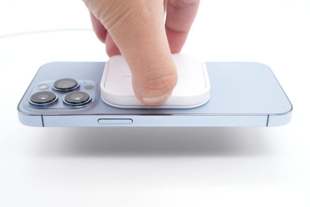 产品机身看着很小,但吸附力很强,可以吸附起iPhone 13 Pro不掉落。