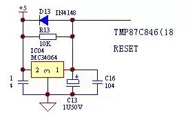 5V电源通过MC34064的2脚输入,1脚便可输出一个上升沿,触发芯片的复位脚。电解电容C13是调节复位延时时间的。当电源关断时,电解电容C13上的残留电荷通过D13和MC34064内部电路构成回路,释放掉电荷。以备下次复位启用。