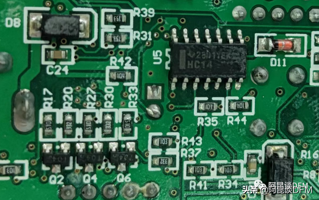 整块板你会发现插件都是手焊,无法波峰焊接,自动化程度度。