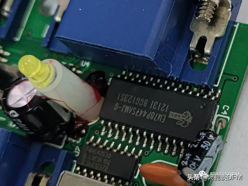 这个引脚较多的芯片查了一下资料是一个单片机,而且还是一次性写的OPT。这个作用除了是控制74HC4053切换外,还有一个就是产生一个虚拟键盘和鼠标信号给到电脑主机的,让切换器不管在切换到哪台电脑主机,都能实实让电脑主机“以为”连接了PS2鼠标和键盘。这样就能随时切换随时用。