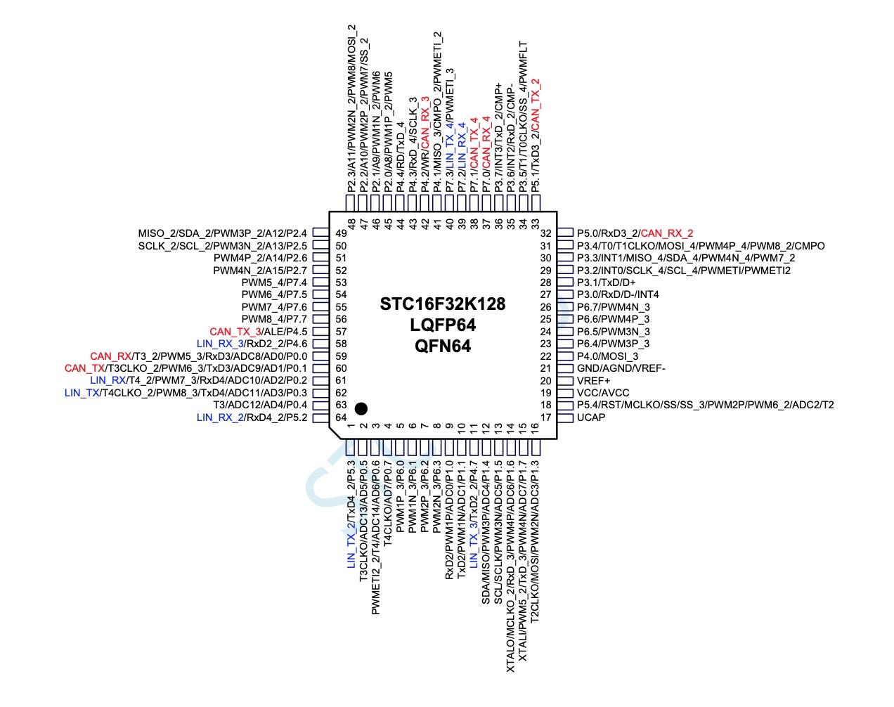 5 个 16 位定时器:定时器 0、定时器 1、定时器 2、定时器 3、定时器 4,其中定时器 0 的模式 3 具有 NMI(不可屏蔽中断)功能,定时器 0 和定时器 1 的模式 0 为 16 位自动重载模式4 个高速串口:串口 1、串口 2、串口 3、串口 4,波特率时钟源最快可为 FOSC/42 组高级 PWM,可实现 8 通道(4 组互补对称)带死区的控制的 PWM,并支持外部异常检测功能SPI:支持主机模式和从机模式以及主机/从机自动切换I2C:支持主机模式和从机模式ICE:硬件支持仿真USB:USB2.0/USB1.1 兼容全速 USB,6 个双向端点,支持 4 种端点传输模式(控制传输、中断传输、批量传输和同步传输),每个端点拥有 64 字节的缓冲区 CAN:一个 CAN 2.0 控制单元LIN:一个 LIN 1.3、2.1 控制单元MDU32:硬件 32 位乘除法器(包含 32 位除以 32 位、32 位乘以 16 位) FPMU:单精度浮点运算器中端