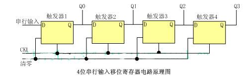 启动时,先在清零端加清零脉冲,使触发器输出置0。然后,第一个数据D0加到触发器1的串行输入端,在第一个CLK脉冲的上升沿Q0=Q0,Q1=Q2。Q3=Q0。其后,第二个数据D1加到串行输入端,在第二个CLK脉冲到达时,Q0=Q1,Q1=Q0,Q2=Q3=0。以此类推,当第四个CLK来到之后,各输出端分别是Q0=Q3,Q1=Q2,Q2=Q1,Q3=Q0。输出数据可用串行的形式取出,也可用并行开式取出。
