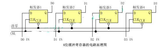 它是用来暂存某个数据,以便在适当的时间节拍和给定的计算步骤将数据输入或输出到其它记忆单元中去,下图是一个并行输入、并行输出的4位缓冲器的电路原理图,它由4个D触发器组成。