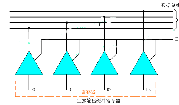当控制端E=0时,输出端呈高阻抗状态,该器件对总线不起作用。当寄存器输出端接至三态门,再由三态门输出端与总线连接起来,就构成三态输出的级冲寄存器。如下图所示就是一个4位的三态输出缓冲寄存器。由于这里采用的是单向三态门,所以数据只能从寄存器输出到数据总线。如果要实现双向传送,则要用双向三态门。