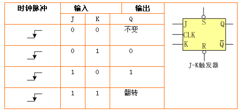 J-K触发器的逻辑符号如下,R、S分别为强制置0、置1端。K为同步置0输入端,J为同步置1输入端。触发器的状态是由时钟脉冲CLK下降沿到来时J、K端的状态决定,其真值表如下
