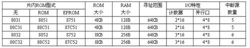 从上表中可以看到,8031、8031、8032、80C32片内是没有ROM的,对应着上表看,我们可以发现,51系列的单片机的RAM大小为128B,52系列的RAM大小为256B,51系列的计数器为两个16位的,52系列的计数器为三个16位计数器。51系列的中断源为5个,52系列的中断源为6个。