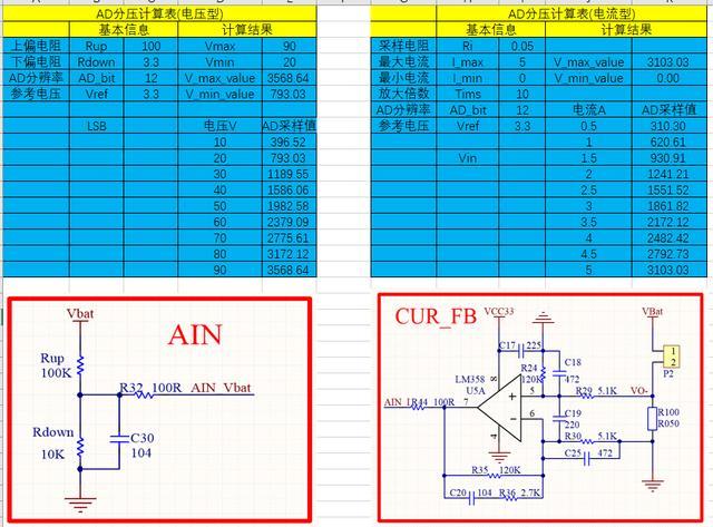 我们来看一下单片机采样电压电路图(1),AIN_Vbat接单片机AD检测口,需要检测的电压Vbat经过电阻R31和R37分压,分压得到的电压送给单片机AD口来检测,分压是是因为需要把Vbat映射到单片机AD口采样范围内,比如Vbat最高电压为90V,单片机AD模块参考电压为3.3V,那么我们就需要把0-90V映射到0-3.3V。因为这是直接检测电压信号,所以不需要转换直接送到单片机AD口即可,图种R31和R37用来分压,C30和R32用来滤波防干扰。