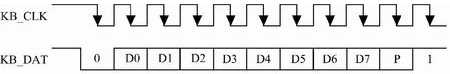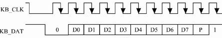这是从设备键盘的发送时序,可以看到,每个数据由11个bit组成,1个起始位(0),8个数据位,1个校验位(奇校验)和一个结束位(1);时钟频率控制在10-20K之间,下降沿有效。