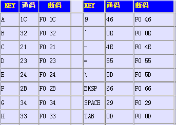 熟悉单片机编程的朋友大都了解IIC吧?乍一看,PS/2协议是不是跟IIC很像呢?所以编程也就简单多了。了解时序之后,我们还要知道键盘上字符所对应的"通码"和"断码",按照码表传输对应的字符就可以了。下面就是部分字符的码表: