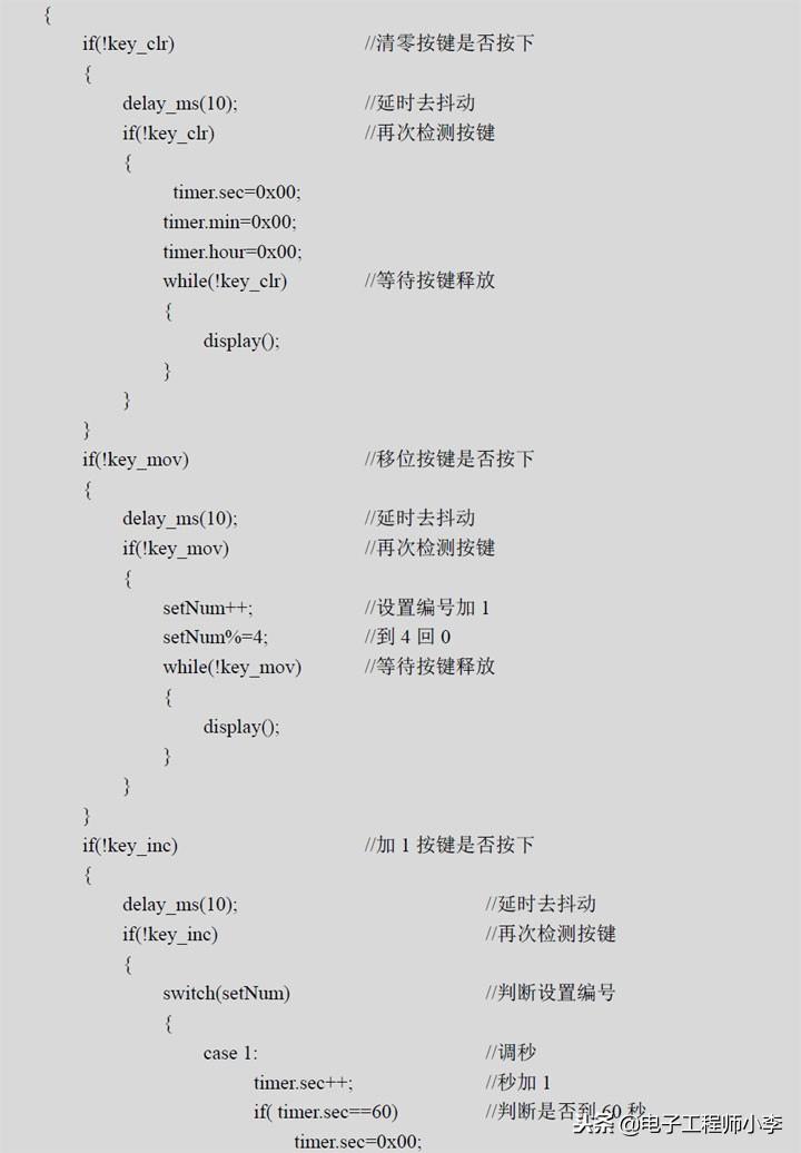➢ 按键检测调时思路 :设置时间变量setNum对移位按键的次数进行记录,默认为0,不进入调时状态,随着移位按键的触发,setNum值加1,程序根据setNum的值分别处于调节秒、分钟、小时状态,当setNum加到4时回到0。
