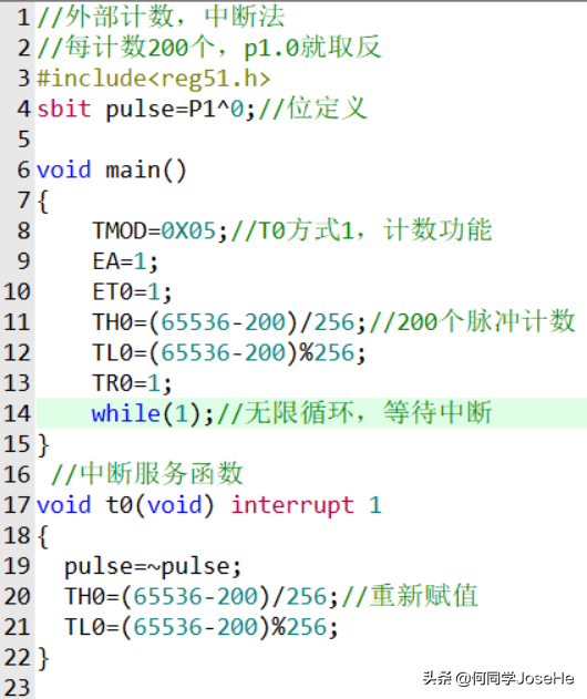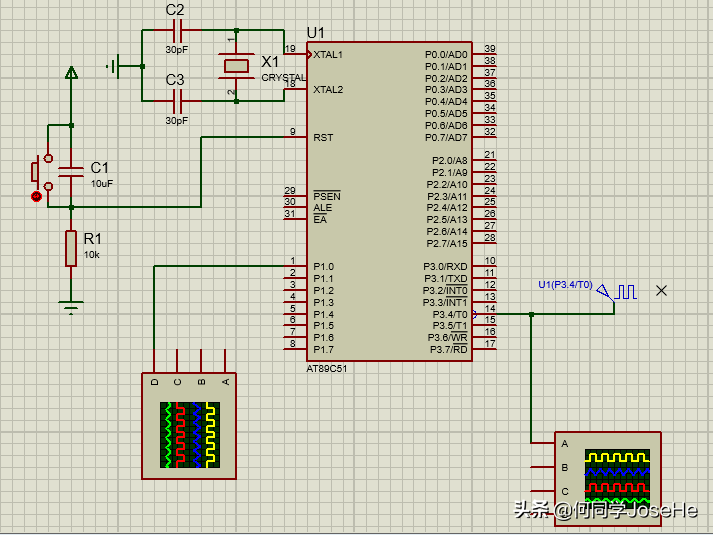 从以上实验可以看出,在proteus仿真中,单片机外部脉冲频率如果小于单片机频率的1/24,误差很小,这是由于运行指令需要消耗时间。即使是超过单片机频率的1/24也可以计数,只不过误差大很多。而在实物中,这个误差会更大,甚至会出现错误。