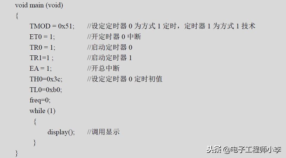 频率是周期的倒数,即每秒钟产生的周期信号的个数。根据频率的定义,充分的利用单片机的定时/计数器资源,由定时器0实现1秒定时,定时器1则对外部脉冲个数进行计数,这样1秒钟内所计的脉冲个数即为输入信号的频率。