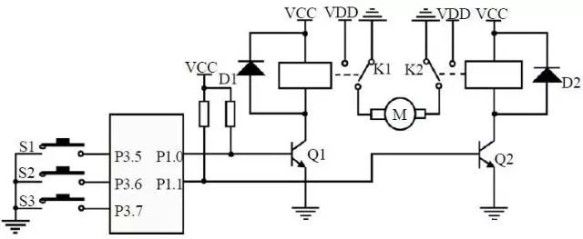 通过按键控制直流电机正反转及停止控制的电路如图9-6所示。由S1键的触发实现电机的正转运行,S2键的触发实现电机的反转运行,S3键的触发实现电机的停止控制。