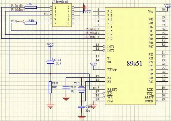 P2为USB接口,CH340G的TXD与单片机的RXD连接,CH340G的RXD和单片机的TXD连接。图中的CH340G用的是5V供电,如果用3.3V供电的话第4脚要连接到3.3V。由于STC51单片机在下载程序的时候要断电再重新上电,所以单片机部分的电源设计如下图所示: