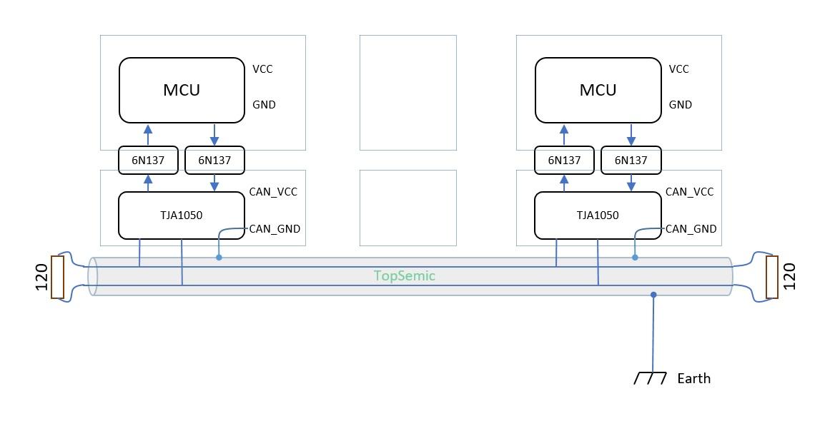CAN常常工作在强干扰的工业环境中,采用屏蔽双绞线会极大的提升EMC防护性能。同时如果数字电路部分和CAN收发器之间用高速光耦隔离开,并且对两部分采用完全隔离的电源供电,那么可以把总线上的干扰最大限度地隔离在外部。