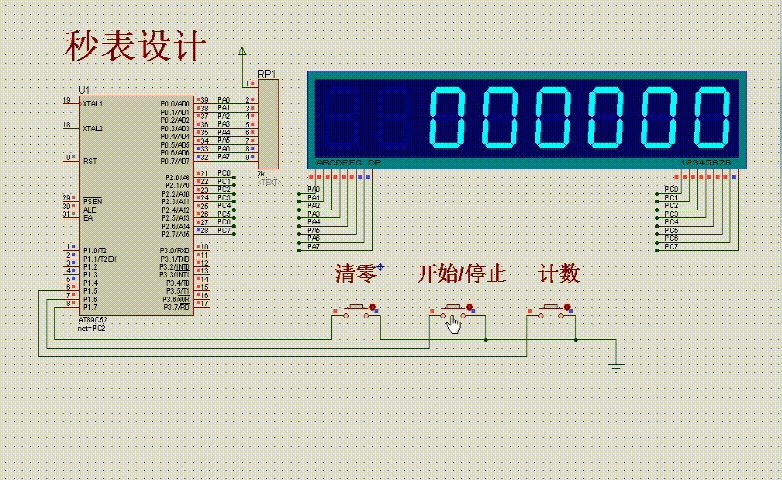 秒表硬件主要的器件有:52单片机;8位数码管显示分别显示时、分、秒、毫秒;有三个按钮分别为清零、开始/停止、计数按钮。