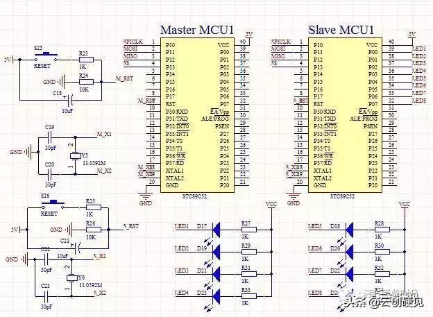 如果要实现连接通讯,确定单片机(Master MCU1)为主模式,单片机(Slave MCU1)为从模式。各自也配置好了SLCK,MOSI,MISO和SCK的io引脚。选择了默认的SPI0模式。原理图如下: