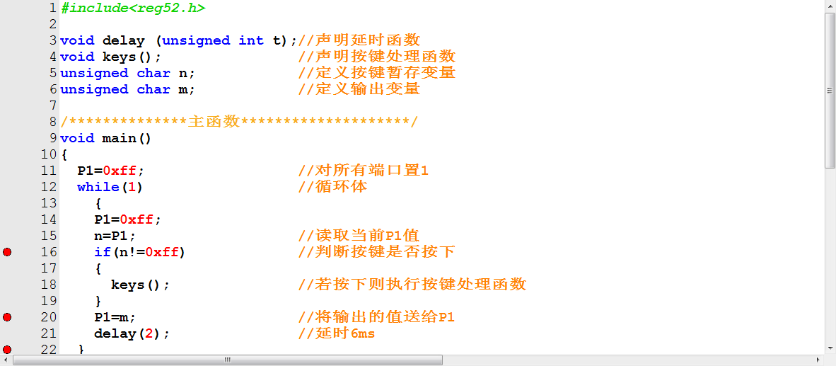 我们的处理方式是,先置1,然后把按键值送给新的变量,判断此时按键是否按下,若按下,则端口的值就不会全为1,此时执行处理函数,判断当前的键值符合什么输出,若符合某一条件,则将输出送给变量m,然后跳出判断,m把数值送给p1完成输出,为了让人眼可以看到,此时需要延时一段时间,我们延时了6ms,小于10ms,完全可以,然后会继续从头开始,往复循环判断键值,如果此时全为1,则就不进入按键处理程序,所以此时m的值不会改变,于是就在结束时继续赋值给P1,这样P1就可以显示我们需要输出的结果,同时,可以作为按键使用。
