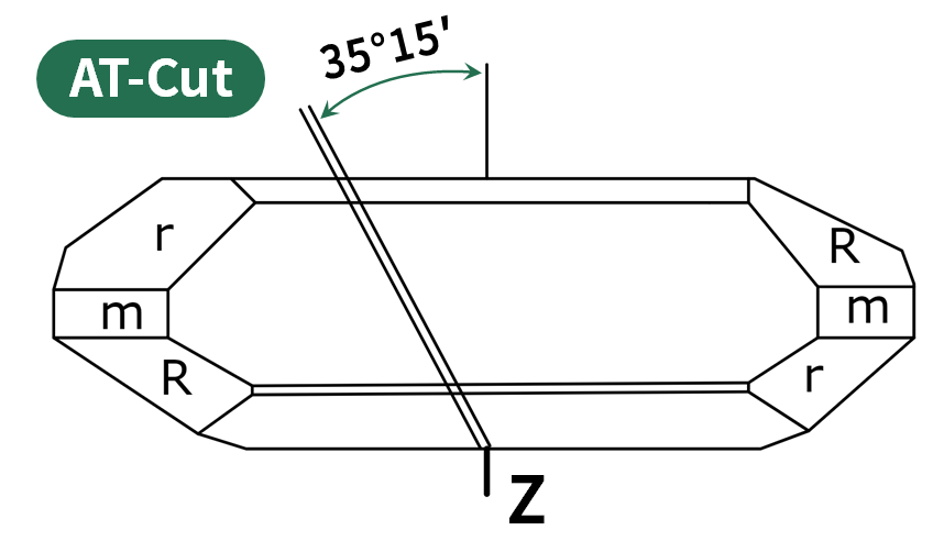 我曾经提到过,晶振是人们将石英晶体按一定的方位角切割后,增加外壳封装而成。切割的角度及打磨的精度决定了晶振的频率及温度特性。大部分的晶振均采用AT切割的方法制造而成,其它的切割方法诸如BT、CT、SC、音叉型等,它们代表着不同的切割角度或切割方式。而AT切割时,它的切割面与Z轴成35°15′角。如图7