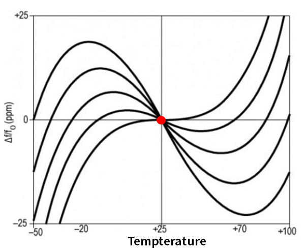 这种石英晶片具有良好的频率-温度特性,它的特性曲线在一定的温度范围内对称,且25℃为曲线的拐点。因此被广泛应用于数MHz到数百MHz的晶振。如图8
