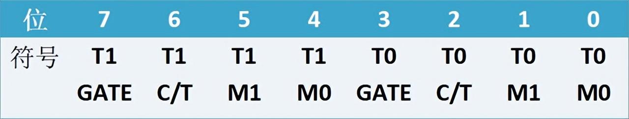 TMOD模式寄存器的低四位T0(0-3)配置定时器/计数器0(Timer0)的工作模式,高四位T1(4-7)配置定时器/计数器1(Timer1)的工作模式,这两部分的结构类似,只是控制的对象不同。