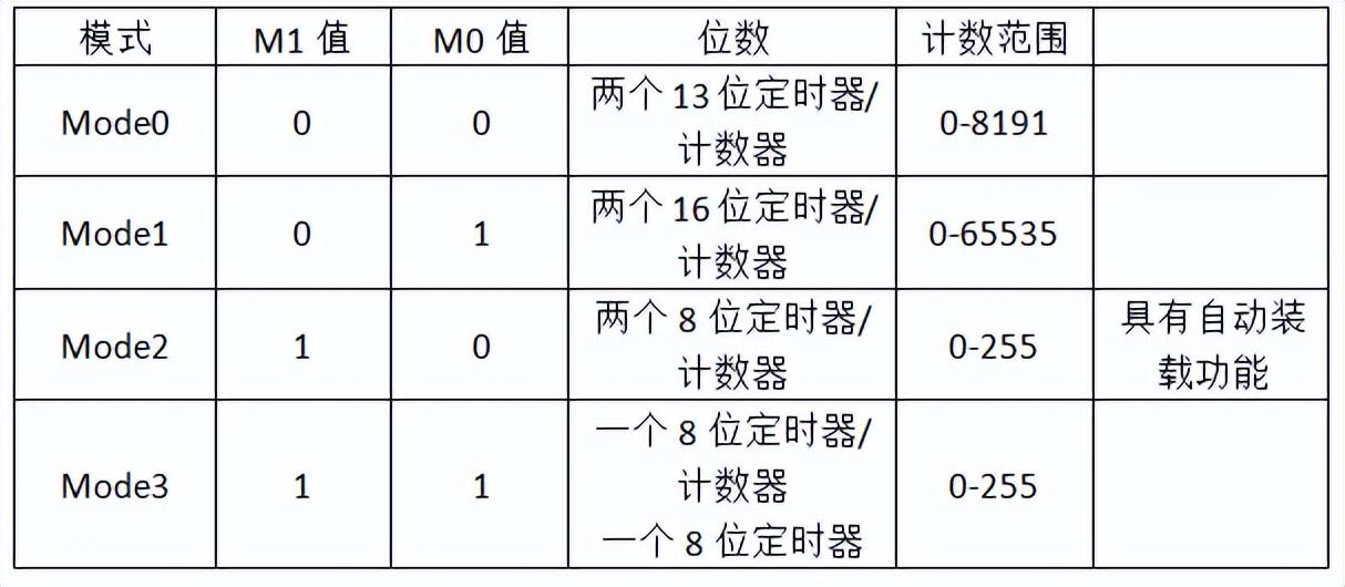 M1/M0:选择定时器/计数器的工作模式,如下表: