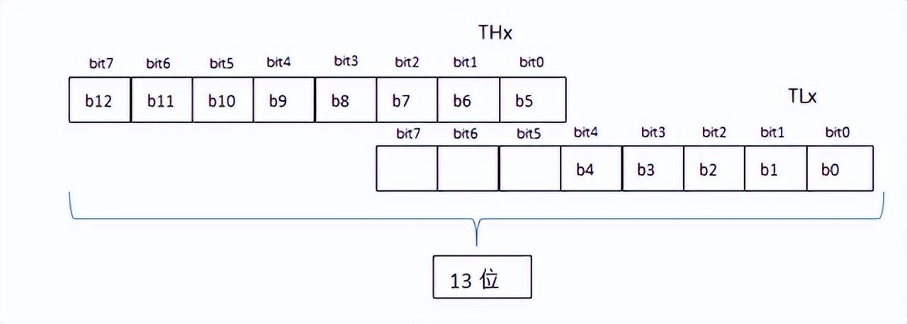 提供两个13位定时器/计数器(Timer 0/Timer 1),如前所述,计数量分别存放在TH1和TL1两个8位计数寄存器里。其中TH1放置8位,TL1放置5。