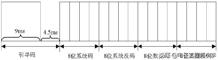 遥控编码脉冲信号通常由引导码、系统码、系统反码、功能码和功能反码组成。引导码由宽度为9ms的高电平和宽度为4.5ms的低电平组成。8位的系统码又称为识别码,主要是为了区分不同的控制系统,防止误动作。8位功能码也称为数据码,其代表相应的控制功能。8位的系统反码和功能反码的加入是为了校对传输过程中产生的差错提高抗干扰性能,遥控编码脉冲信号组成如图4-8所示。