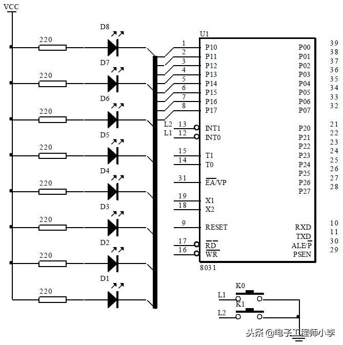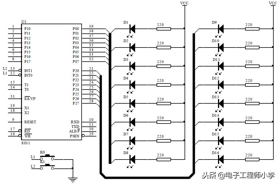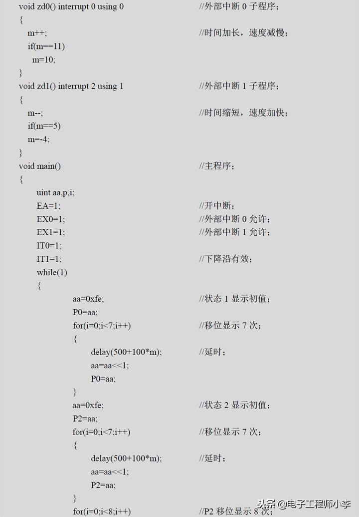 【例2】 2个按健中断控制流水等灯的速度,按健K0用以减慢速度控制,按健K1用以加快速度控制,硬件电路如图4-5所示。