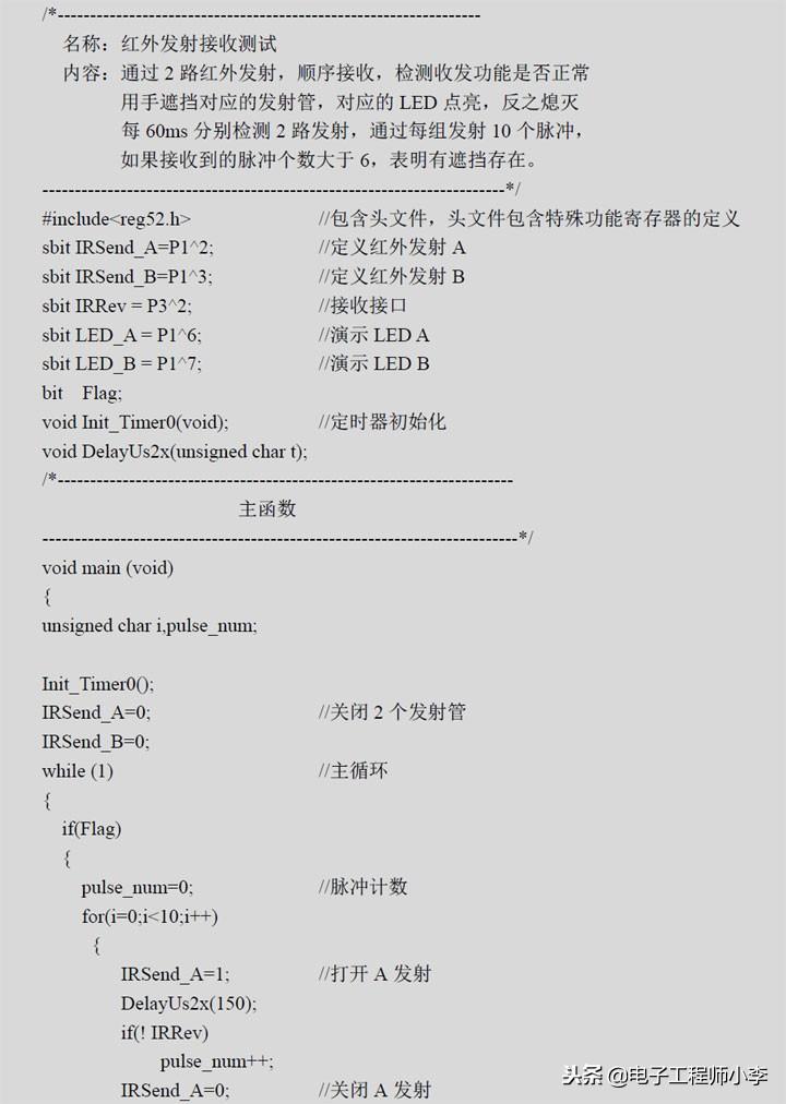 【例4】 利用单片机外部中断实现遥控解码。具体功能:通过电视机遥控器向单片机系统板上的一体化红外线接收头发射红外遥控编码信号,由于一体化红外线接收头的输出端与单片机的外部中断0相连,从而触发单片机产生中断,单片机根据红外遥控信号的组成对功能码进行识别,并通过P1口的发光二极管显示该功能码。