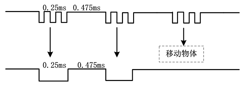 移动物体检测采用红外通信编码的方式。这种检测不持续发射,而是每隔5ms发射一个持续时间为0.25ms、频率为40KHZ的载波信号,相当于“红外雷达”,对≥50cm长的物体以180千米/小时通过时,其经过探头的时间为10ms,可被检测两次,完全能满足检测需要。检测原理如图4所示。